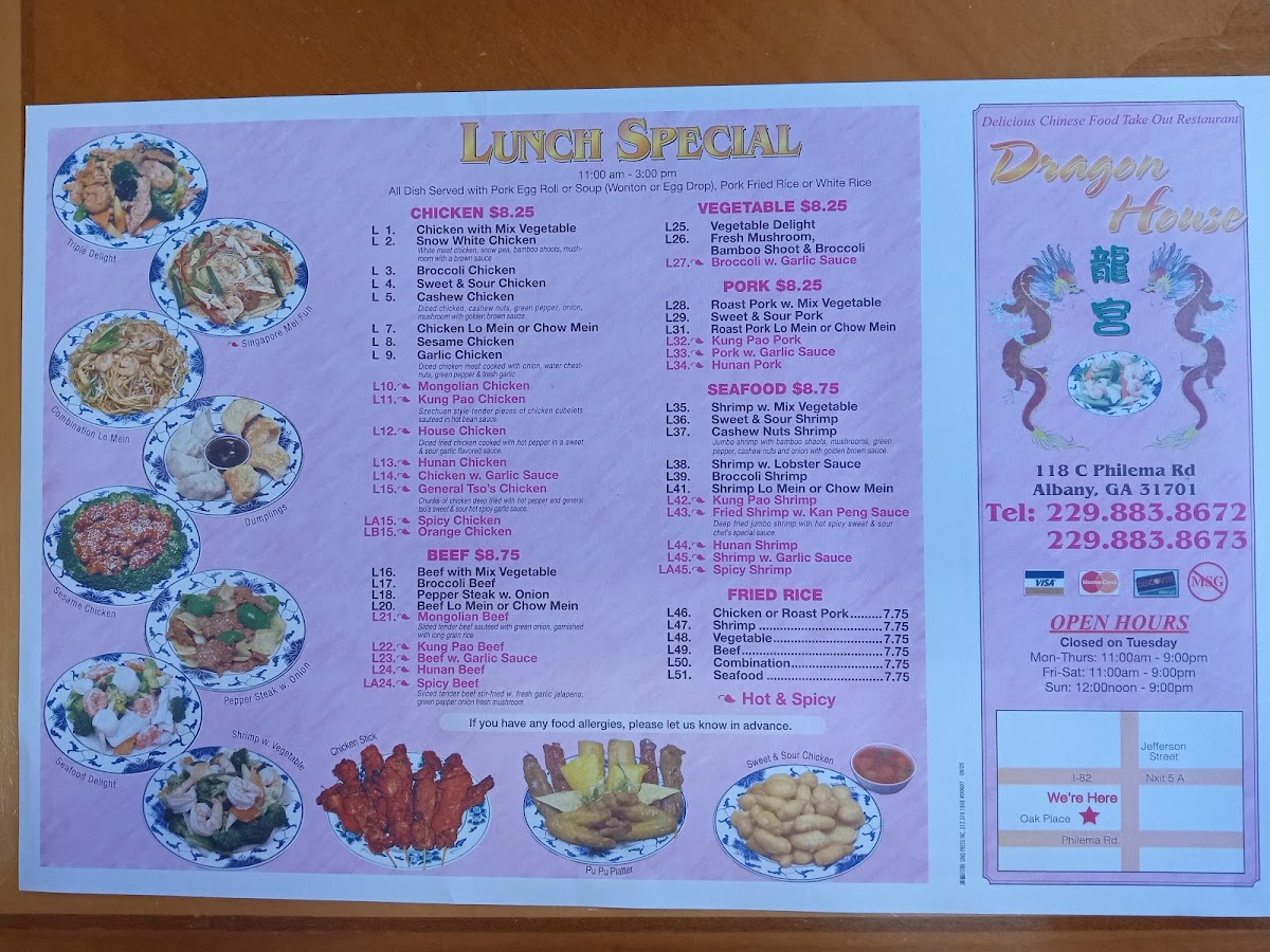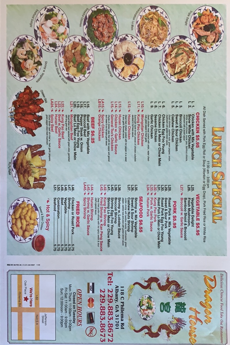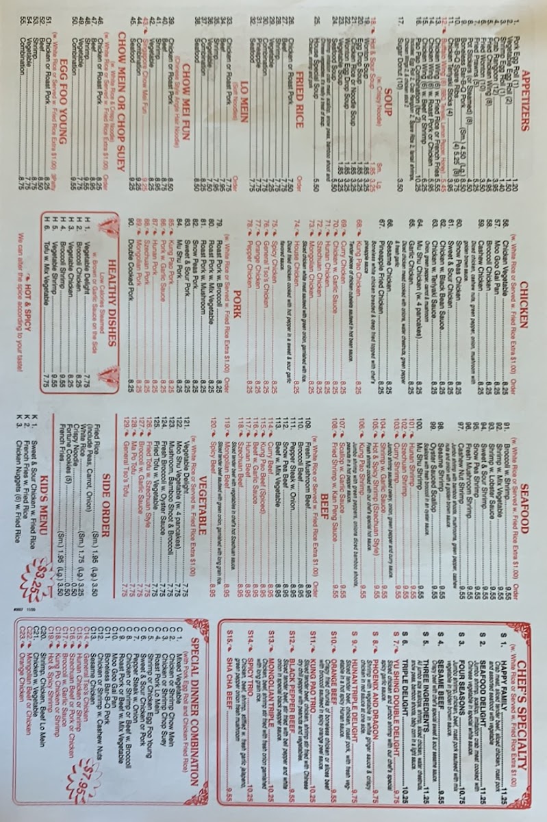 From a reviewer’s perspective, the menu at Dragon House Chinese offers a concise yet satisfying selection of classic dishes that cover all the essentials without overwhelming choices. The appetizers, such as the One Pork Egg Roll and Two Vegetable Rolls, provide a simple and familiar start, while comforting soups like Hot and Sour Soup and Wonton Soup set a warm tone for the meal. Moving into heartier options, staples like Chicken Fried Rice and Roast Pork Fried Rice deliver dependable flavor, complemented by equally traditional noodle dishes such as Chicken Lo Mein and Roast Pork Lo Mein. For those seeking a slightly different texture, the Chicken Mei Fun and Roast Pork Mei Fun offer a lighter, rice-noodle alternative. Although the menu does not highlight pricing details, its straightforward lineup of recognizable favorites makes it approachable and ideal for anyone craving classic Chinese comfort food without unnecessary complexity.